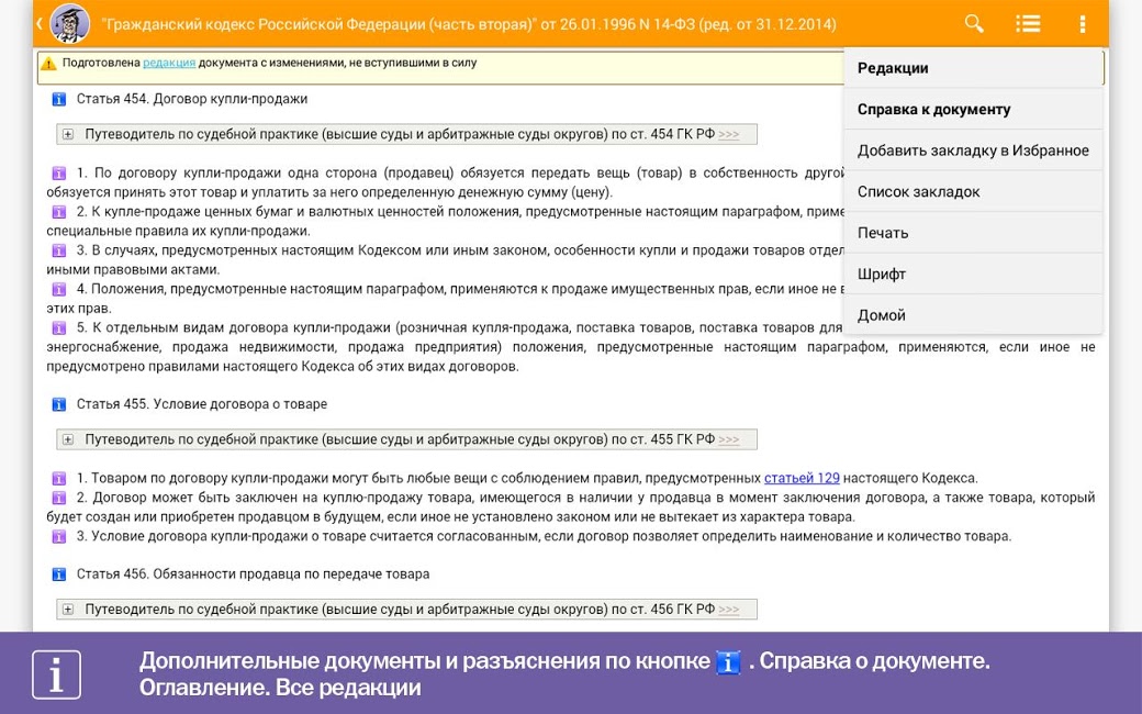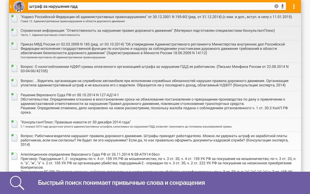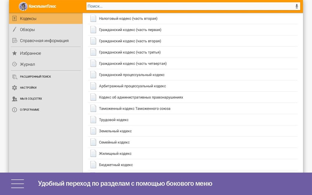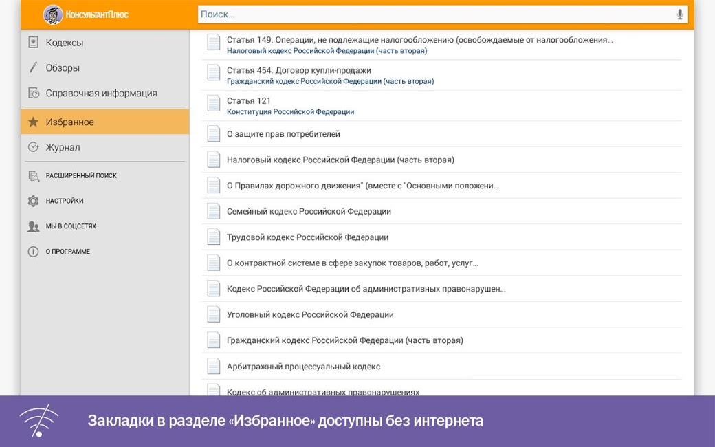 Приложение «КонсультантПлюс» дает доступ к наиболее значимой правовой информации. Это кодексы Российской Федерации, основные правовые акты, новые документы и справочные материалы.