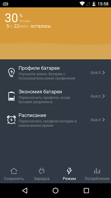 Battery Doctor отображает точное время работы батареи и оставшееся время зарядки, позволяет использовать эффективную трехступенчатую систему подзарядки устройства, а также применять несколько разных режимов энергосбережения, которые можно устанавливать на время учебы или работы, отдыха или сна и т.п. При этом приложение показывает пользователю точное оставшееся время работы батареи, учитывая используемые в конкретный момент программы и функции телефона.